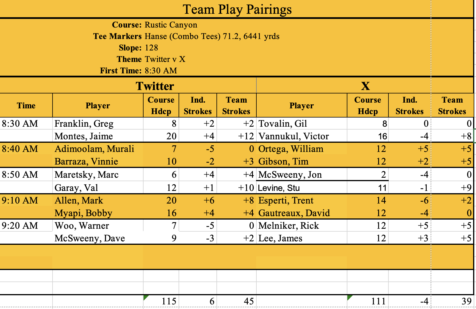 Hi all: Here's an updated tee sheet - Sean Trundy is replaced by Jaime Montes. See you soon.