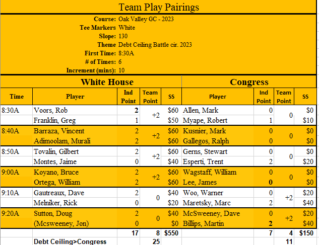 Below is the result of last Sunday's tournament at Oak Valley. White House won the Debt Ceiling Battle over Congress by a landslide margin of 25:11...Ooch!