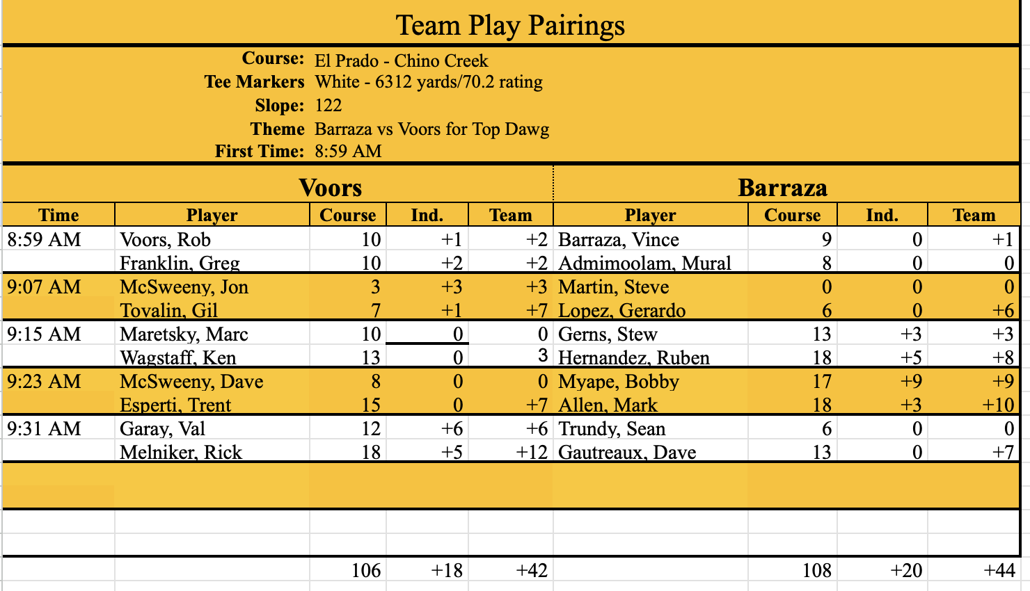 I've attached the pairing sheet for tomorrow. First tee time is 8:59. The