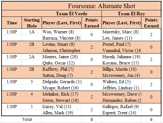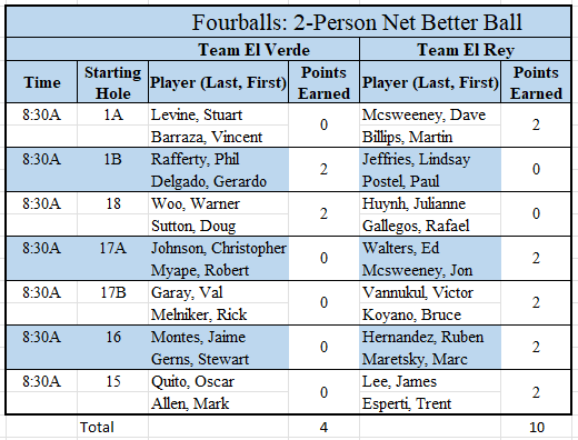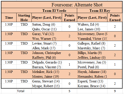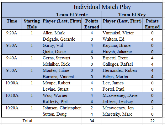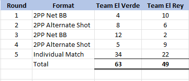 Below are the results of our exciting Ryder Cup event last week. We had great weather all three days and, all our players had good times (Team El Verde) or not-so-good times (Team El Rey). Congratulations to Team El Verde for their success in defending the Ryder Cup.