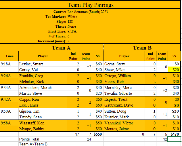 The A-Team wins last Sunday's match plays event at Los Serranos GC over B-Team; 24-12. Congrats!