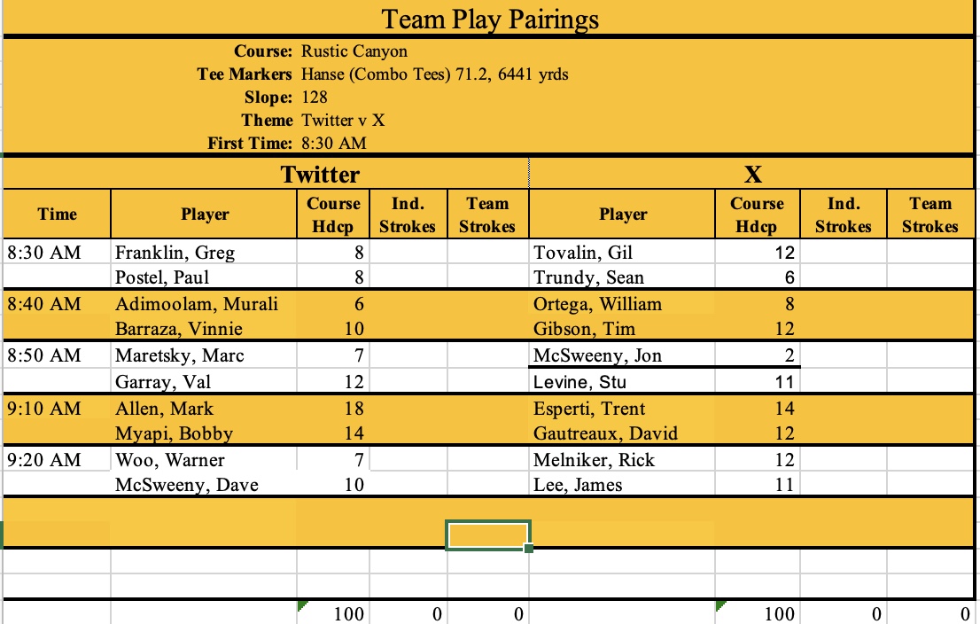 Here are the pairings for Sunday’s event at Rustic Canyon in Moorpark. I will update the course handicaps on Friday and send the final pairings sheet at that time. Find a replacement player if anything comes up that would keep you from playing. The green fees have already been paid.