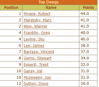 The top four finishers get the bye in the first round. They are Bobby Myape, Marc Maretsky, Warner Woo, and Stu Levine (TB- RC points earned over Greg Franklin).