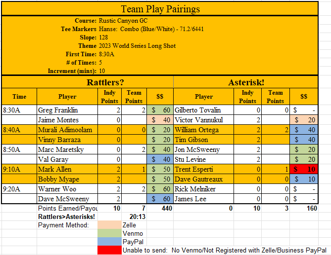 Below are the results of the Sunday's match. The payout to the winners was made earlier today via Venmo/PayPal FF or Zelle except for Trent. Trent, please call me when you have a chance. Let me know if you did not receive it.